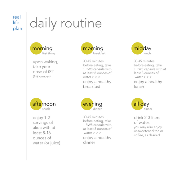and that’s your day! we don’t want you to feel super regimented but keep in mind that a schedule and a plan help you to be successful. be consistent with it! take your iS2 dose. take your RW8 pills. take your akea. and drink your water!